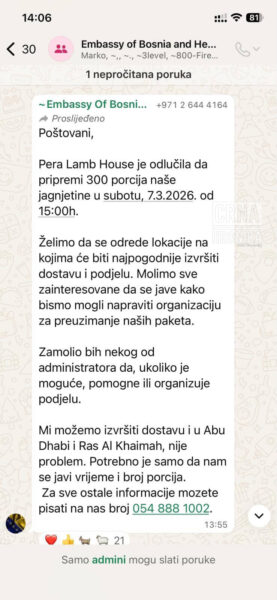 Poruka je podijeljena u WhatsApp grupi za komunikaciju Ministarstva vanjskih poslova BiH i nadležnih veleposlanstava s građanima Bosne i Hercegovine.