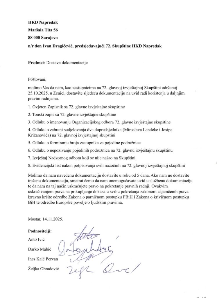 Četiri zastupnika 72. glavne izvještajne Skupštine HKD Napredak – Anto Ivić, Darko Mabić, Ines Kaić Pervan i Željka Obradović – podsjećaju da su još 14. studenoga 2025. predsjedavajućem Skupštine i organizacijskom odboru uputili službeni zahtjev za dostavu cjelokupne dokumentacije sa Skupštine održane 25. listopada u Zenici. Odgovor, kako navode, do danas nisu dobili ni od predsjedavajućeg ni od Stručne službe HKD Napredak.