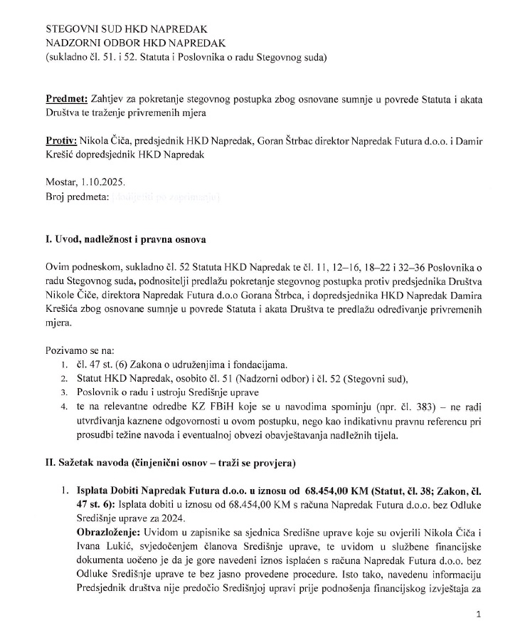 Zahtjev za pokretanje stegovnog postupka protiv Nikole Čiče, predsjednika HKD Napredak, Gorana Štrbca direktora Napretka Futura d.o.o. i Damira Krešića dopredsjednika HKD Napredak Stegovnom sudu i Nadzornom uputili su član HKD Napredak Josip Križanović, član Središnje uprave HKD Napredak Anto Ivić, članica Središnje uprave HKD Napredak i predsjednica podružnice HKD Napredak Livno Ines Kaić-Pervan, te član Upravnog odbora Glavne podružnice HKD Napredak Mostar Željko Koren.