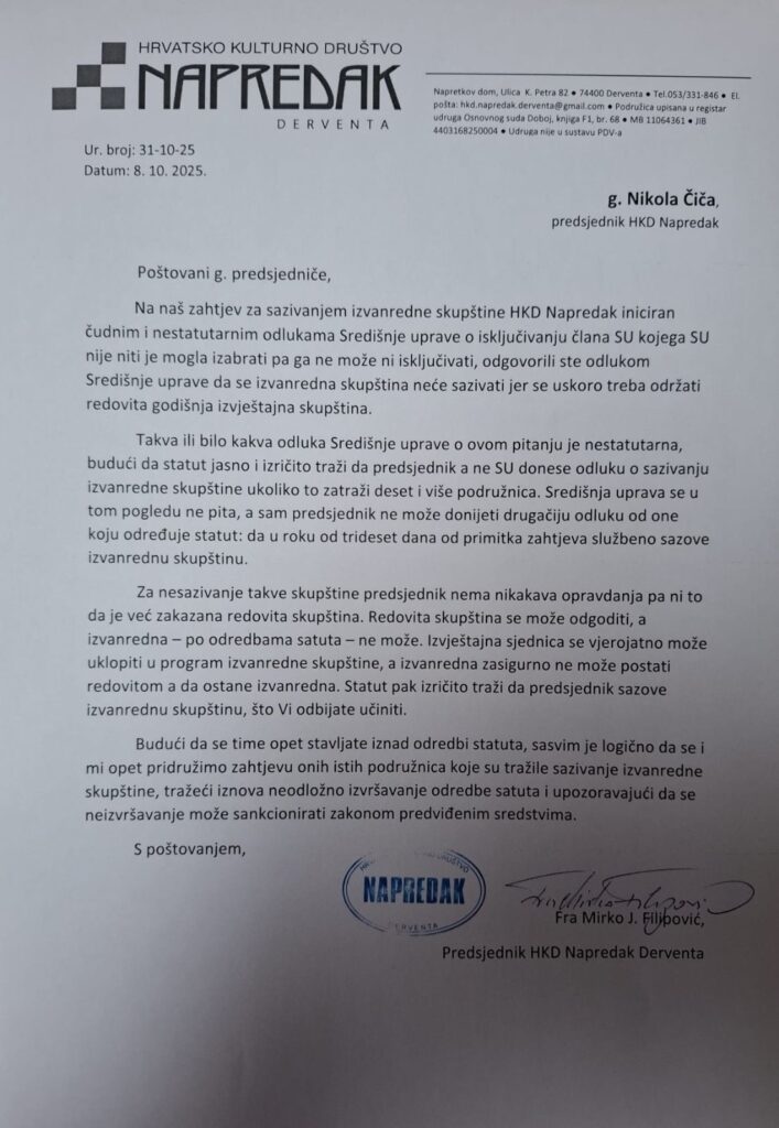 “Uvidom u zapisnike sa sjednica Središnje uprave koje su ovjerili Nikola Čiča i Ivana Lukić, svjedočenjem članova Središnje uprave, te uvidom u službene financijske dokumente uočeno je da je gore navedeni iznos isplaćen s računa Napredak Futura d.o.o. bez odluke Središnje uprave koja jedina može donijeti takvu proceduru. Isto tako, na temelju informacija predsjednik društva nije predočio Središnjoj upravi financijska izvješća za 2024. te je tek naknadno o tome istu informaciju i predočio Nadzornom odboru kao prihod od Napredak Futura i doveo u zabludu Nadzorni odbor Društva. Nije poznato na koji način je i kako potrošen navedeni iznos u 2024. Naknadno je Središnja uprava donijela odluku da se dobit Napredak Future d.o.o. zadrži. Uvidom u usvojeni financijski plan za 2024. jasno je da Središnja uprava nije niti planirala isplatu dobiti niti bilo kakav prihod Napredak Future d.o.o. Traži se provjera odluke o raspodjeli dobiti, financijskog plana za 2024, izvještaj Nadzornom odboru. Predlaže se naložiti dostavu kompletne dokumentacije NO-u i obavijestiti nadležne institucije”, navodi se u zahtjevu koji potpisuju Križanović, Pervan-Kajić, Ivić i Koren. Uz financijsku dokumentaciju za 2024. traže se i detalji oko kupovine automobila za potrebe članova Središnje uprave i Napredak Future d.o.o. u Zagrebu.