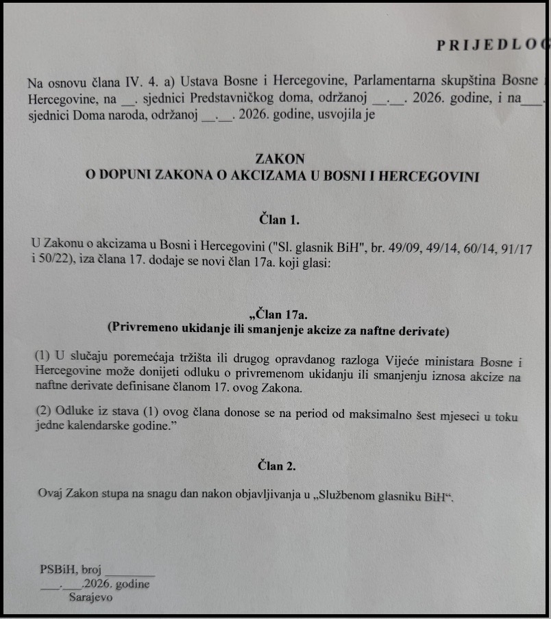 Zastupnički dom Parlamentarne skupštine BiH trebao bi 16. ožujka raspravljati o mogućem privremenom smanjenju ili ukidanju akciza na naftne derivate. Zastupnik Saša Magazinović upozorava da svako odgađanje zakonodavne procedure dodatno otežava situaciju za građane i gospodarstvo, te naglašava da država u kriznim okolnostima mora reagirati, iako to kratkoročno smanjuje proračunske prihode.