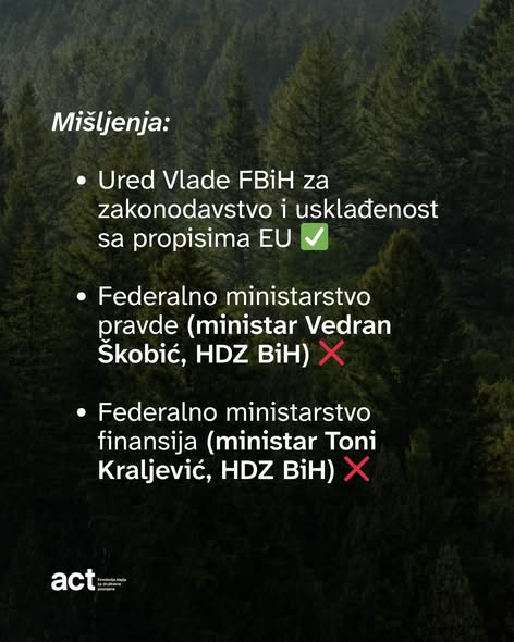 Iako se radi o mišljenjima koja bi trebala biti tehničke naravi, ACT upozorava da su ona u praksi postala učinkovit mehanizam blokade donošenja zakona koji regulira upravljanje jednim od najvažnijih prirodnih resursa u BiH.