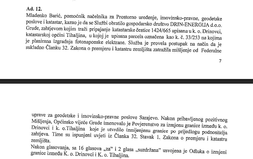 “Služba je provela postupak na način da je sukladno Članku 32. Zakona o premjeru i katastru zemljišta zatražila mišljenje od Federalne uprave za geodetske i imovinsko-pravne poslove Sarajevo. Nakon pribavljenog pozitivnog Mišljenja, Općinsko vijeće Grude imenovalo je Povjerenstvo za izmjenu granice između k. o. Drinovci i k. o. Tihaljina koje je utvrdilo izmijenjenu granicu po prijedlogu podnositelja zahtjeva. Time su ispunjeni uvjeti iz Članka 32. Stavak 1. Zakona o premjeru i katastru zemljišta. Nakon glasovanja, sa 16 glasova „za” i 2 glasa „suzdržana” usvojena je Odluka o izmjeni granice između K. o. Drinovci i K. o. Tihaljina”, navodi se u zapisniku sa sjednice.