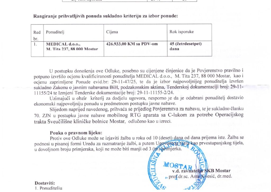 Nije to omelo našeg ravnatelja da od Medicala u svibnju ove godine nabavi 666.385 maraka usluge servisa uređaja u bolnici.