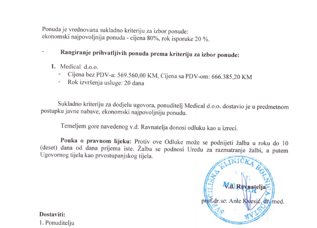 Pregledom javnih nabavki Sveučilišne kliničke bolnice u Mostaru u zadnjih godinu dana utvrdili smo da je ravnatelj osobno potpisao preko 2 milijuna maraka novca tvrtki Medical smještenoj u Titovoj u Mostaru, a vezanoj za Sašu Pozdera, koji je u Hrvatskoj pao sa bivšim ministrom zdravstva, a zbog preplaćivanja medicinske opreme.
