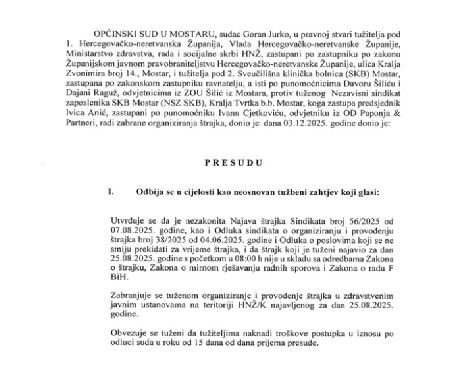 U presudi koju je 3. prosinca 2025. donio sudac Goran Jurko, Općinski sud u Mostaru odbio je u cijelosti kao neutemeljen tužbeni zahtjev Vlade HNŽ-a, Ministarstva zdravstva i SKB-a Mostar, kojim se tražila zabrana organiziranja štrajka Nezavisnog sindikata zaposlenika SKB-a Mostar.