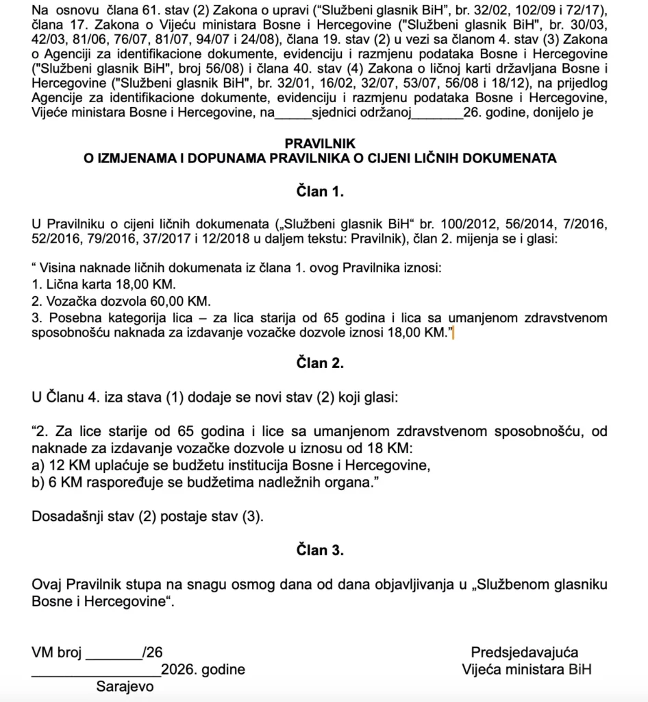 Prema predloženim izmjenama, u članku 2. dodaje se posebna kategorija osoba, prema kojoj za osobe starije od 65 godina i osobe s umanjenom zdravstvenom sposobnošću naknada za izdavanje vozačke dozvole iznosi 18 KM.