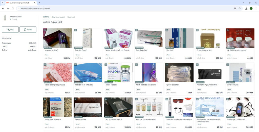 Tržište u BiH preplavljeno je neregistriranim, ilegalno uvezenim preparatima za estetske tretmane. Razni botoksi, fileri i serumi lako se naručuju putem interneta, a koriste ih liječnici, frizeri i kozmetičari u nelicenciranim ordinacijama i salonima, često u potpuno neadekvatnim higijenskim uvjetima, pa čak i u privatnim stanovima. Neki nude i brze „edukacije“ koje traju pola sata, gdje polaznici uče na „modelima“ – pacijentima koji zauzvrat dobivaju jeftin tretman, a „polaznici“ upitne certifikate.
