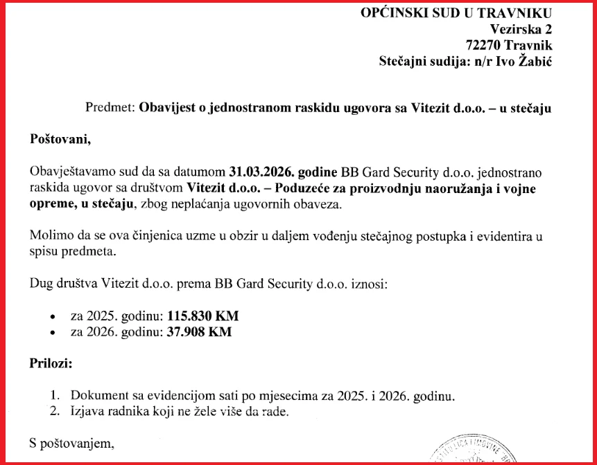 Od “Vitezita” je odustala i zaštitarska firma koju je svojevremeno angažirala Huseinbegović. Prošlog tjedan uputili su dopis o konačnom raskidu ugovora zbog neplaćanja usluga.
