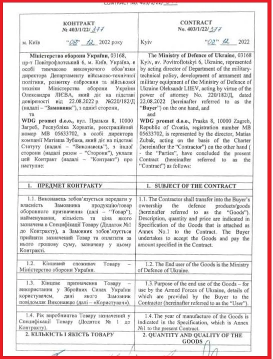“Ukrajinska strana nije mogla dobiti tranzitne dozvole, što je otežalo realizaciju ovog ugovora. Istovremeno, u očekivanju mogućih komplikacija, ‘WDG promet’ je uspio pronaći alternativni izvor nabavke tražene robe kako bi ispunio ugovor. Nudimo dvije mogućnosti. ‘WDG promet’ traži dodatnu uplatu od 7% kako bismo mogli osigurati robu, a u ovom slučaju je možemo isporučiti u roku od 60 dana. Ako ne, firma WDG spremna je vratiti primljeni depozit”, pisao je u martu ove godine Matias Zubak Ministarstvu obrane Ukrajine.