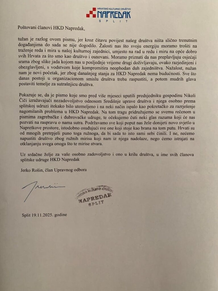 Jerko Rošin, član Uprave HKD Napredak – Split, poznati splitski arhitekt, skladatelj i bivši saborski zastupnik, uputio je otvoreno pismo svim članovima i podružnicama HKD-a Napredak. U svom obraćanju Rošin otvoreno poručuje kako smatra da je došlo vrijeme da Nikola Čiča odstupi s dužnosti predsjednika te da se sazove nova Skupština Društva.
