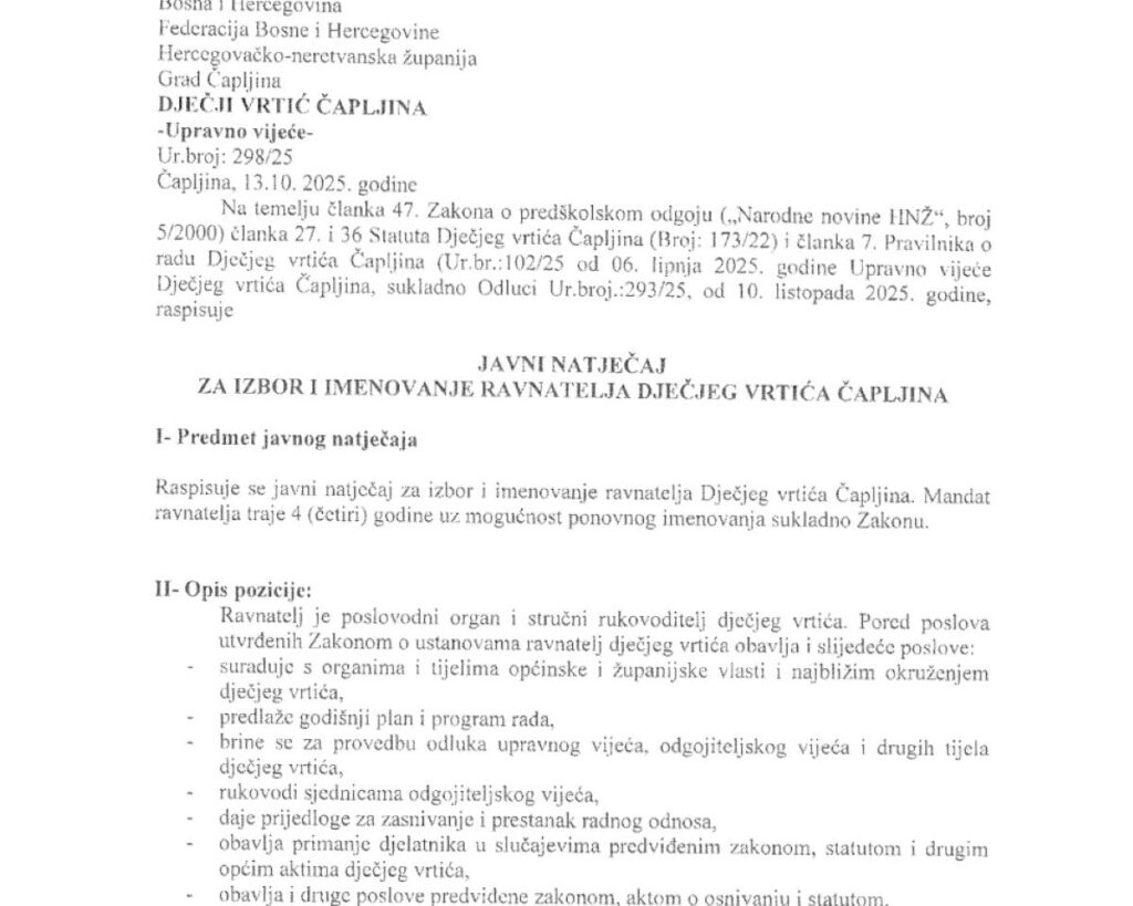 Naime, Upravno vijeće dječjeg vrtića Čapljina je 13. listopada raspisalo natječaj za imenovanje ravnatelja vrtića. Prijave s dokumentacijom su predala 3 kandidata, a po natječaju trebalo je bodovati dokumentaciju i na temelju rang liste upravno vijeće treba donijeti odluku. Bodovanja nije bilo, a dan nakon intervjua je upravni odbor donio odluku o imenovanju ravnatelja, potvrdili su Istini kandidati koji nisu očito podobni za ovu funkciju. Izabrana je ranija v.d. ravnateljica Nives Rotim, inače sestra bivše supruge Smiljana Vidića.