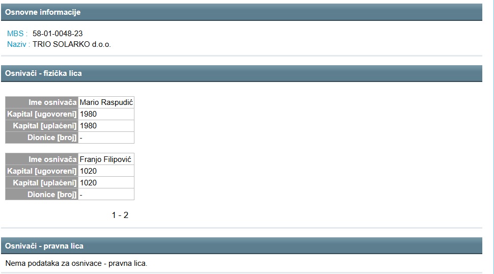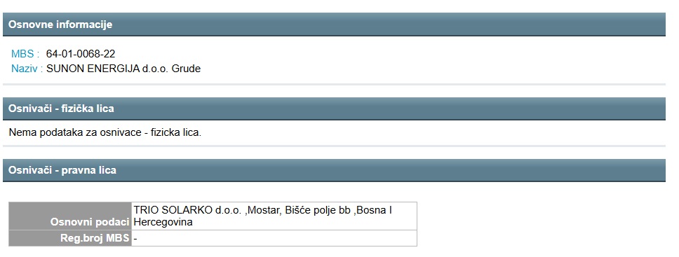 Po registru poslovnih subjekata osnivač Sunon energije je tvrtka Trio solarko Mostar – Bišće polje, dok su osnivači Tria solarko Mario Raspudić i Franjo Filipović. Dakle solarna firma iz Mostara je osnivač solarne firme u Grudama koja će graditi solare u Čapljini.