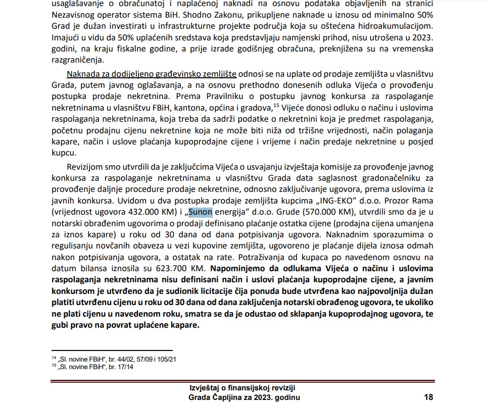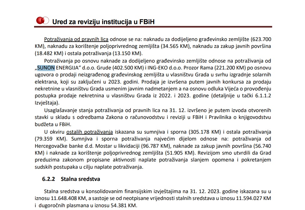 Uvidom u dva postupka prodaje zemljišta kupcima „ING-EKO“ d.o.o. Prozor Rama (vrijednost ugovora 432.000 KM) i „Sunon energija“ d.o.o. Grude (570.000 KM), utvrdili smo da je u notarski obrađenim ugovorima o prodaji definirano plaćanje ostatka cijene (prodajna cijena umanjena za iznos kapare) u roku od 30 dana od dana potpisivanja ugovora. Naknadnim sporazumima o reguliranju novčanih obaveza u vezi kupovine zemljišta, ugovoreno je plaćanje dijela iznosa odmah nakon potpisivanja ugovora, a ostatak na rate. Potraživanja od kupaca po navedenom osnovu na datum bilansa iznosila su 623.700 KM”, naveli su federalni revizoru.