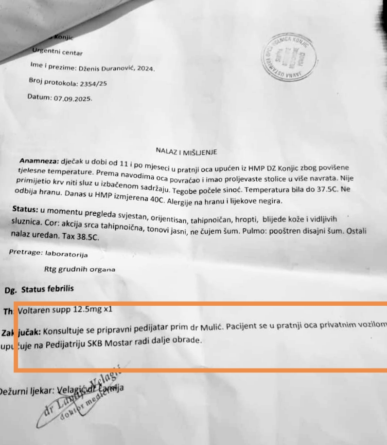 “Onda se dogodila nesreća u Podorašcu, dovukli su sa hitnom povrijeđenog motociklistu. Njemu su pružali pomoć, a muž je sa Dženisom stajao u sobi za previjanje, gdje se nije obraćala pozornost na dijete, a dijete je iz minute u minute sve gore bilo. Samo su prokucali uputnicu za SKB Mostar gdje piše da se otac uputi za Mostar osobnim vozilom”, kaže majka i prilaže i pečatiran nalaz na kojem jasno piše da se otac u Mostar upućuje osobnim vozilom.