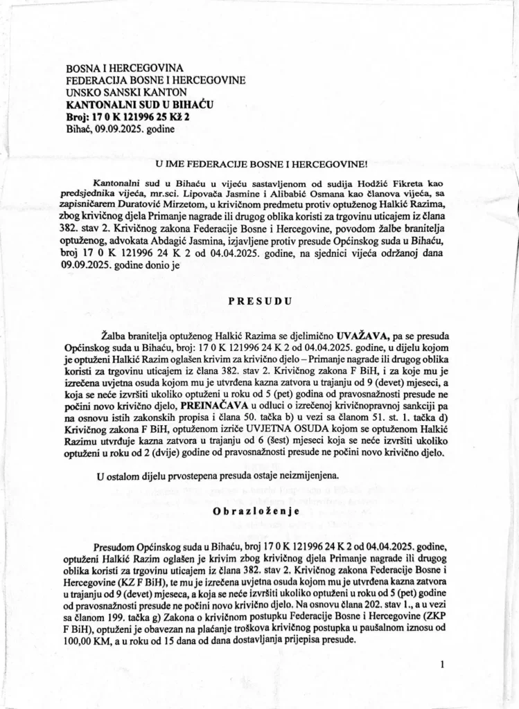 Županijsko sud u Bihaću donio je presudu početkom ovog mjeseca, a ona je preinačena u odnosu na prvostupanjsku. Naime, djelomično je usvojena Halkićeva žalba. Prvostupanjskom presudom bio je osuđen uvjetno na devet mjeseci zatvora s rokom kušnje od pet godina.