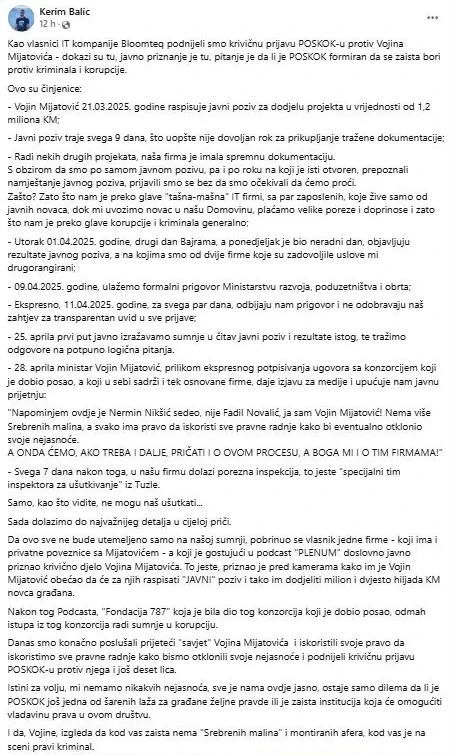 Navode da su se prijavili na javni poziv za dodjelu projekta vrijednog 1,2 milijuna KM, koji je 21. ožujka 2025. raspisao Mijatović. Tvrde da su odmah prepoznali nepravilnosti i „namještanje“ javnog poziva te nisu očekivali da će biti izabrani, piše Faktor.