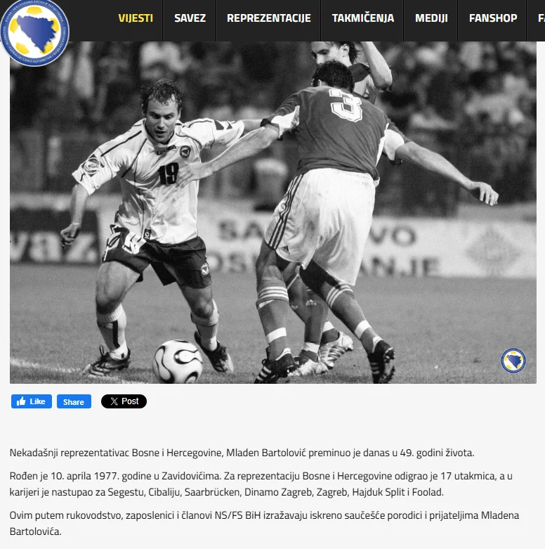 Mladen Bartolović preminuo je u ponedjeljak u 49. godini života, nakon borbe s teškom bolešću. Riječ je o bivšem reprezentativcu BiH i nogometašu brojnih klubova u regiji.
