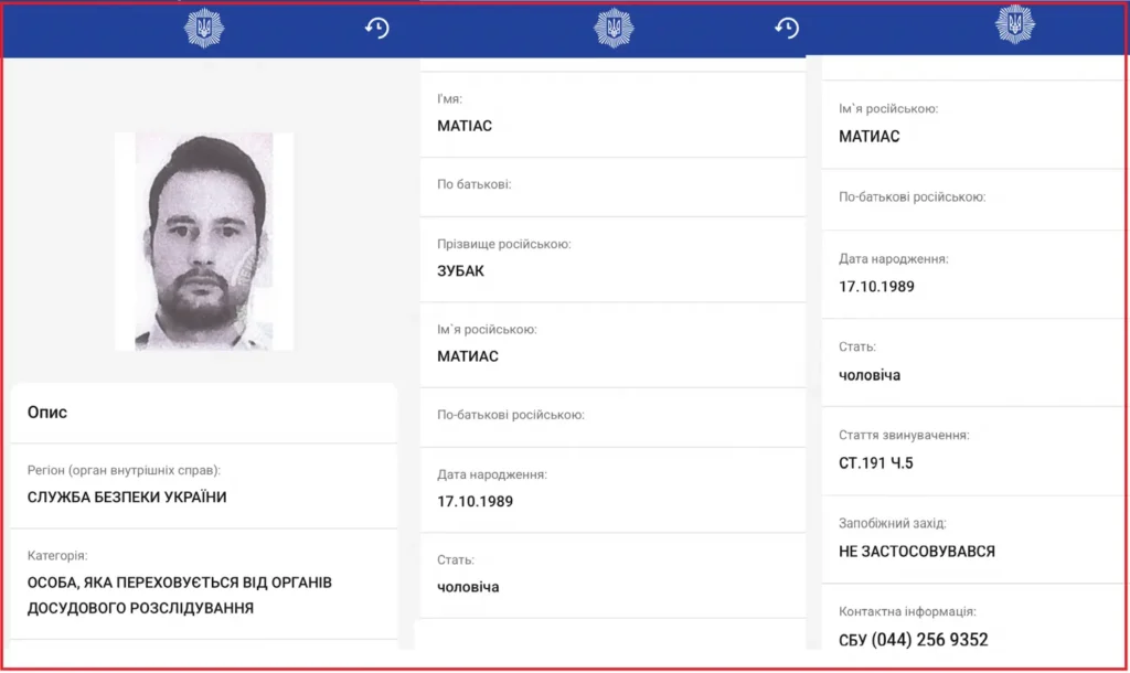 Ministarstvo unutarnjih poslova Ukrajine na svojoj službenoj web-stranici, u rubrici traženih osoba, navelo je Matiasa Zubaka kao osobu koja se skriva od istražnih tijela, u okviru istrage koju vodi Sigurnosna služba Ukrajine (SBU). Formalno, tretira ga se kao osumnjičenika u odsutnosti.